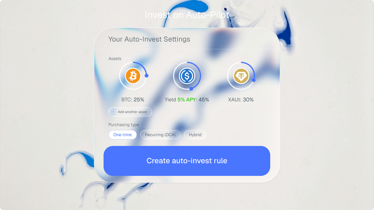 Choose the assets you want to build positions in - Bitcoin, gold, yield, or a split across all three - set your allocation in dollar or percentage terms, and pick a frequency. Once you deposit AUD, the platform executes automatically according to the rules you've defined. No charts to read, no timing decisions, and no manual trades. Consistent position-building that runs on autopilot.