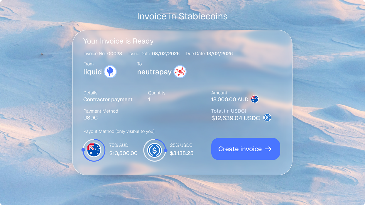 For businesses the real shift is on the inbound side. Our invoice engine lets you create an invoice in AUD, generate a unique payment link, and have your overseas client settle in stablecoins on their preferred network, whilst automatically delivering it to your preferred network. There's no prior discourse needed with your payer about the network to send it on. The whole thing looks and works like a normal invoice, except settlement is instant.